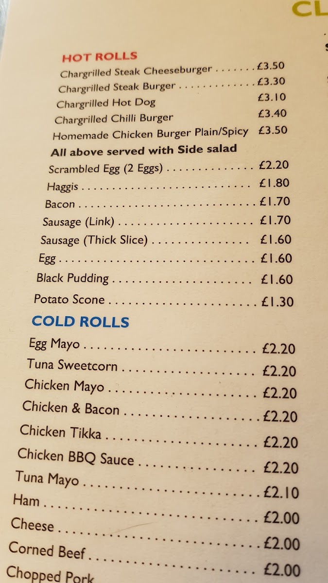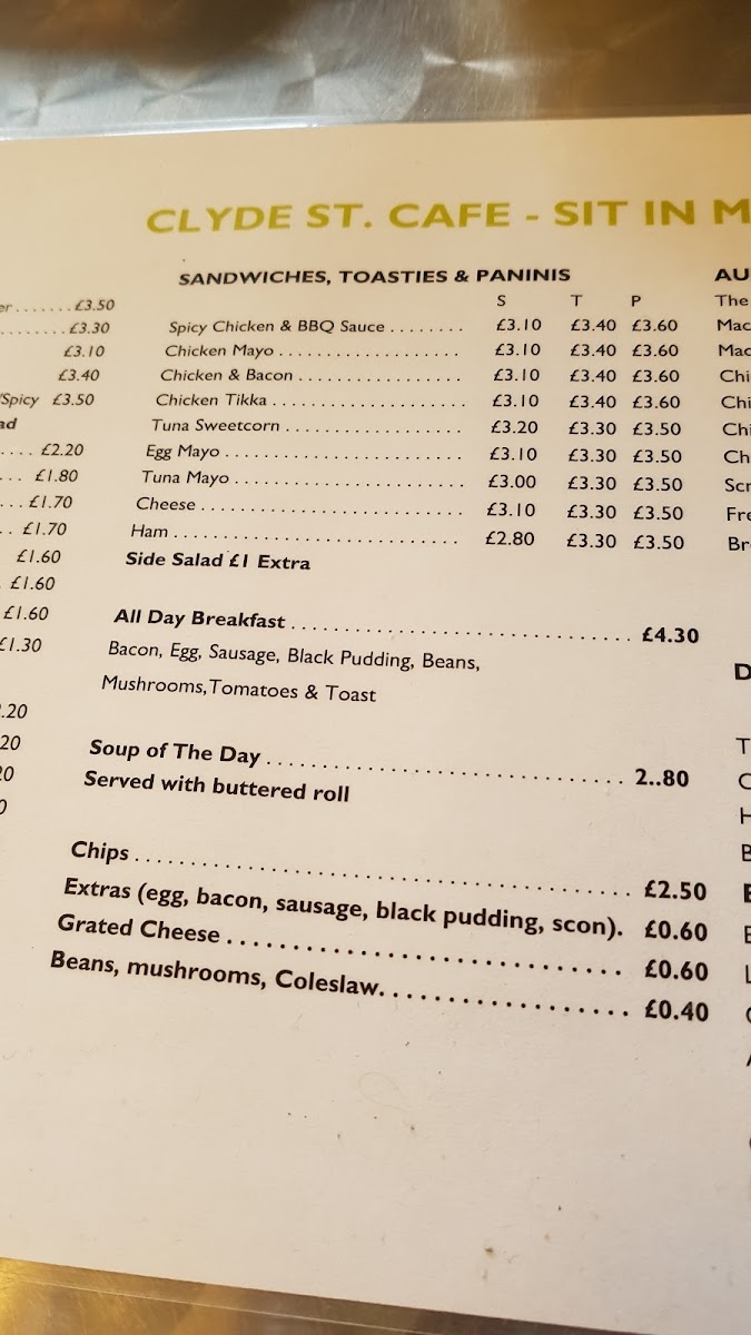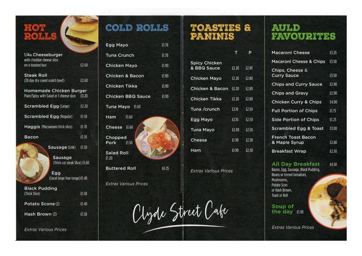 Welcome to Clyde St. Cafe, a beloved local gem nestled in the heart of Helensburgh. Known for its mouthwatering menu, this cozy café serves up an impressive array of hot rolls such as the classic Cheeseburger, Scrambled Eggs, and even Haggis for those seeking a Scottish twist. The Auld Favourites section boasts hearty meals like Macaroni Cheese and Chicken Curry & Chips, perfect for any palate. Don’t overlook their delightful coffee options ranging from rich Espresso to creamy Latte. Regulars rave about the generous portion sizes and the outstanding value for money, making it the ideal spot for breakfast or a quick lunch. The friendly atmosphere, paired with quality ingredients, keeps customers coming back for more. Whether you're indulging in a Breakfast Wrap or warming up with Soup of the Day, Clyde St. Café is a must-visit for food enthusiasts.